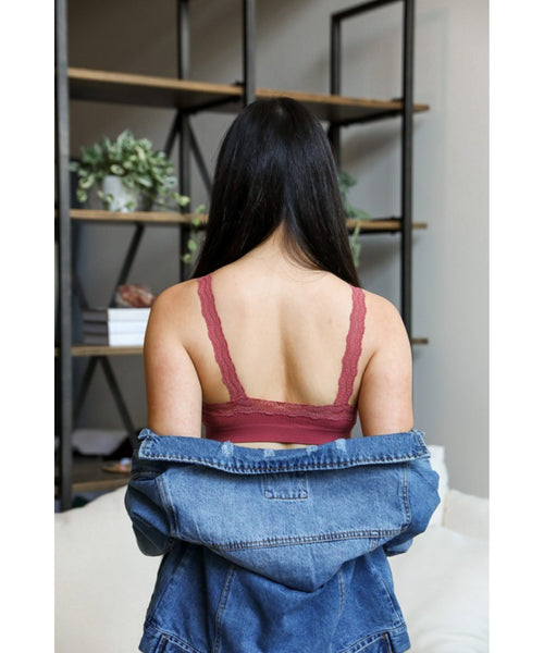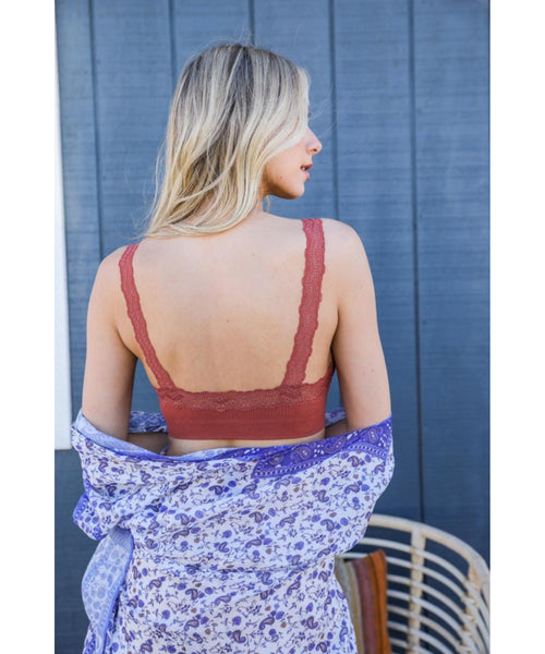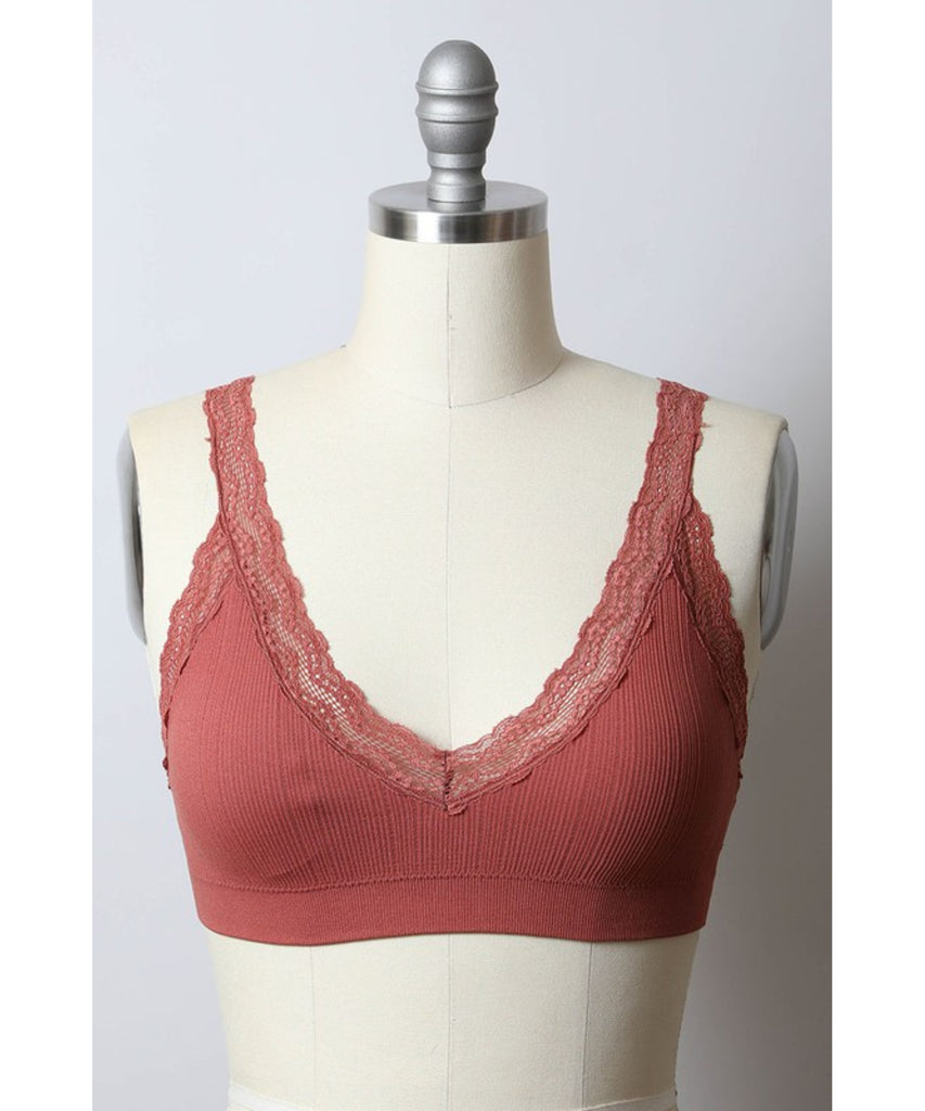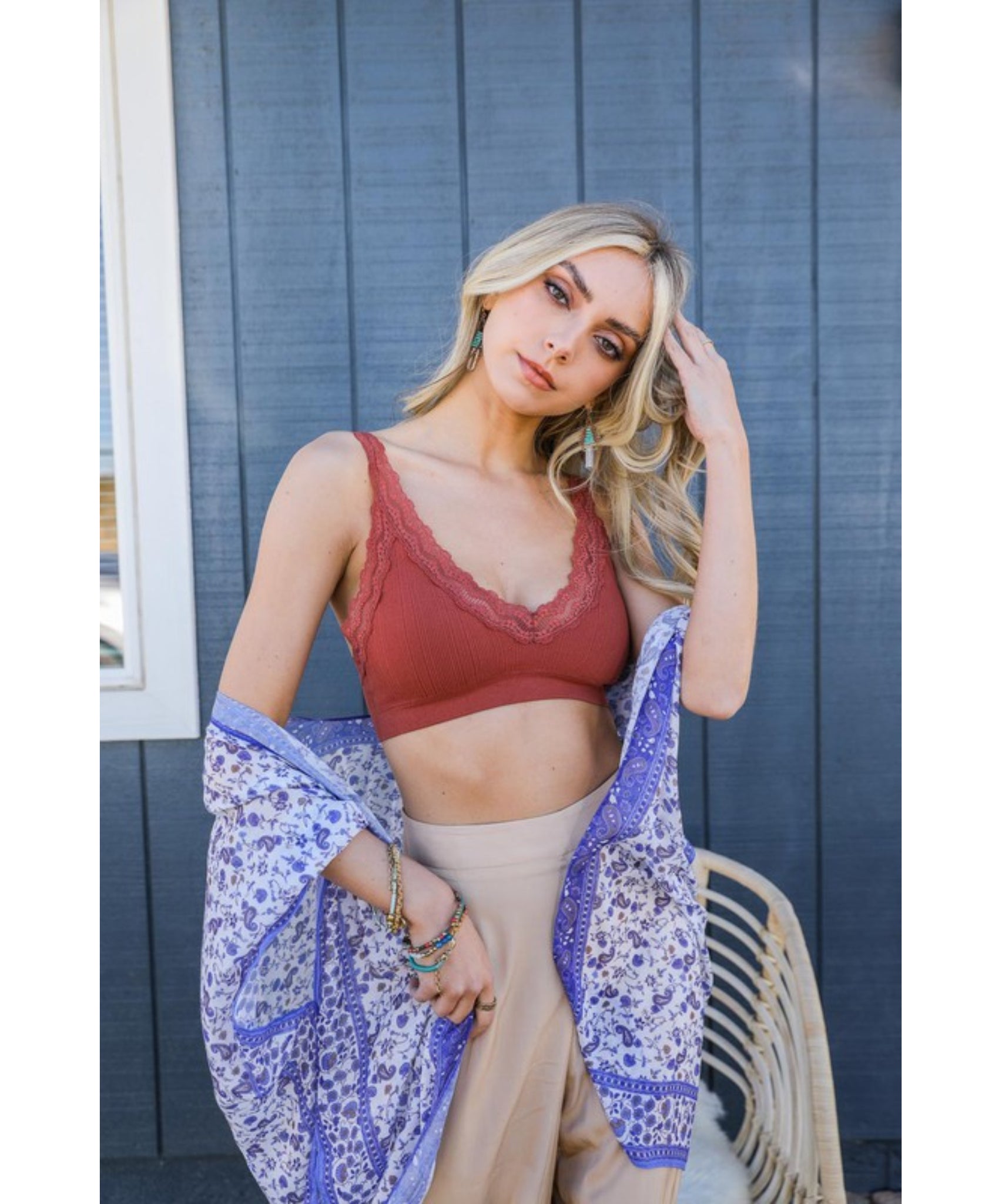 Padded bralette features lace trim and ribbing. Perfect for layering! Multiple color options!