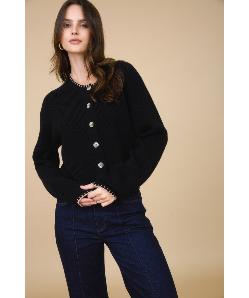 Slip into cozy sophistication with this black knit cardigan, elevated by charming taupe whipstitching that adds visual interest and texture. Crafted from irresistibly soft yarn, it's the kind of piece that feels as good as it looks—perfect for layering over your favorite basics or dressing up casual outfits with effortless style.