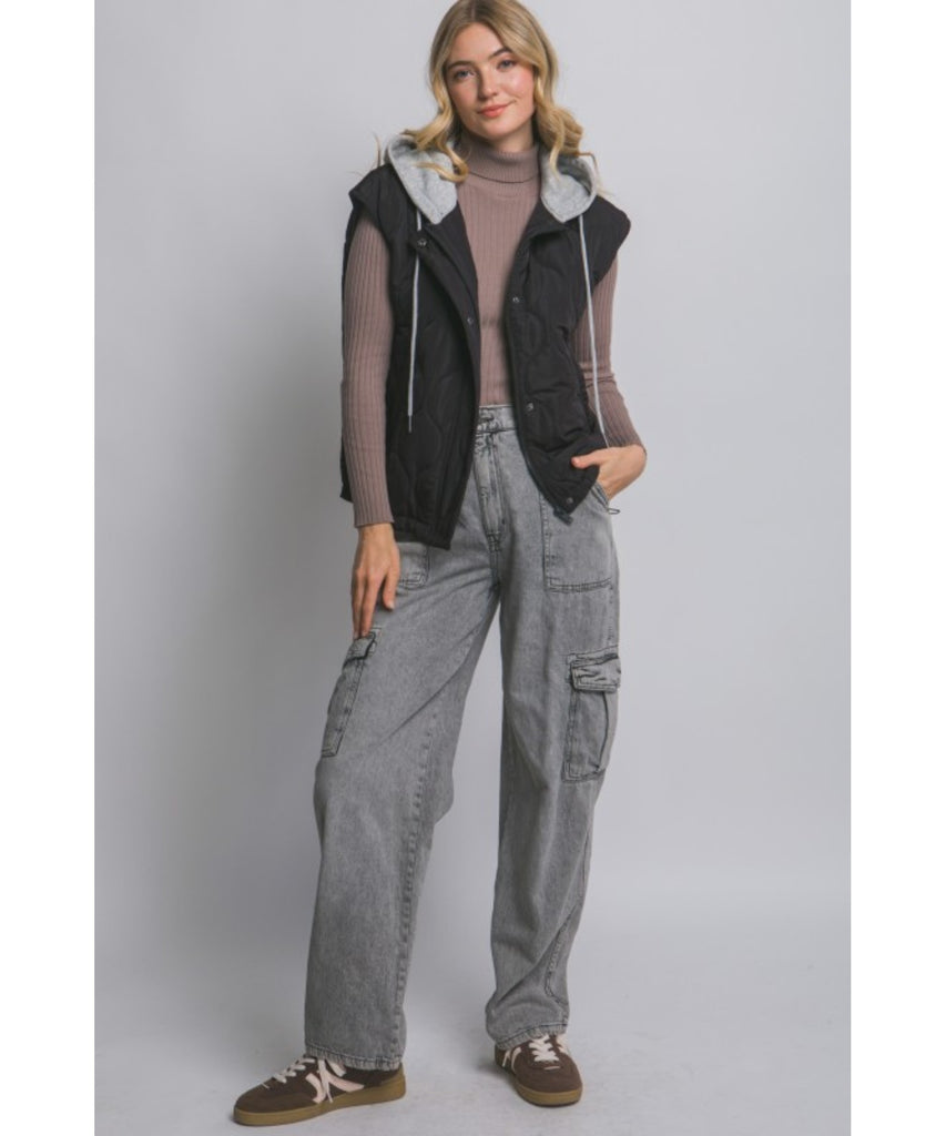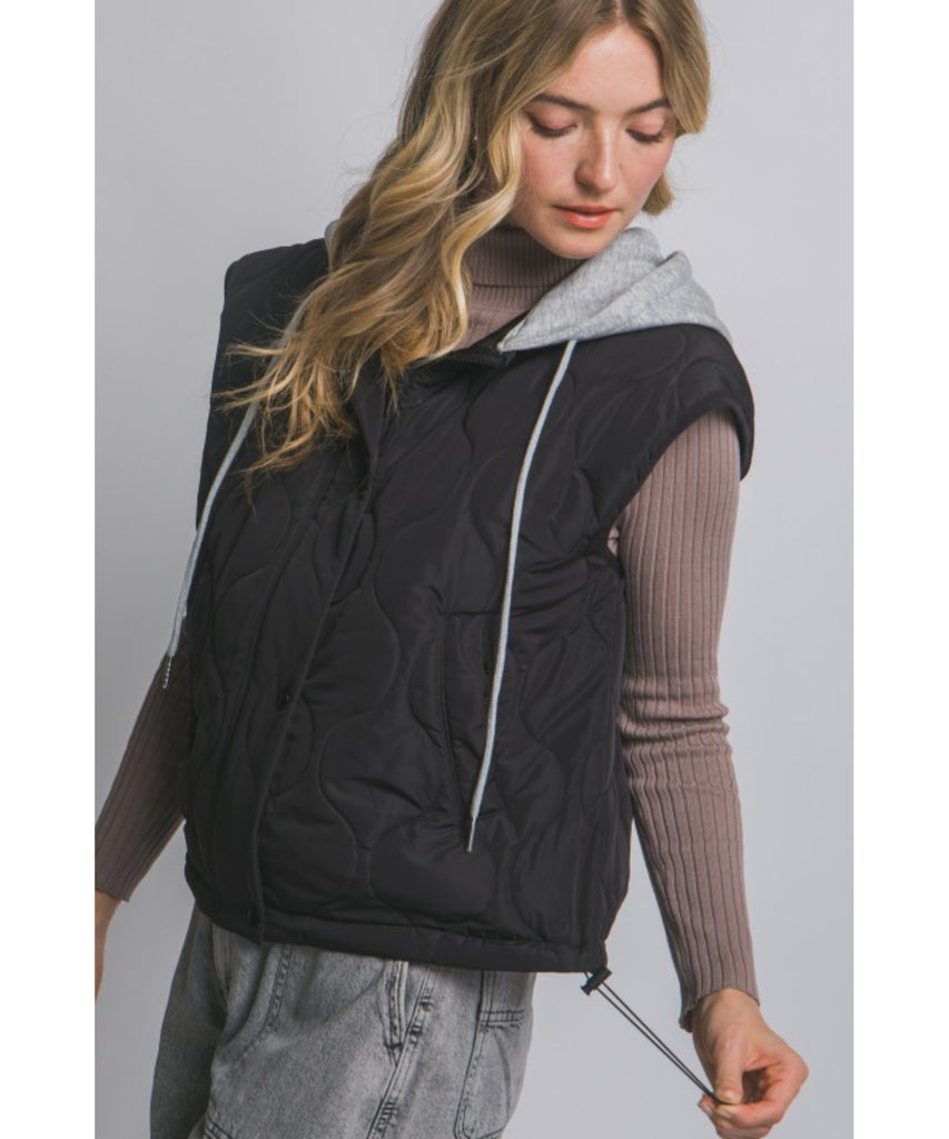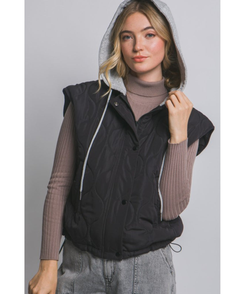 This stylish quilted vest is designed with a hood, snap and zip button closures, adjustable drawstrings, and side pockets for added functionality.