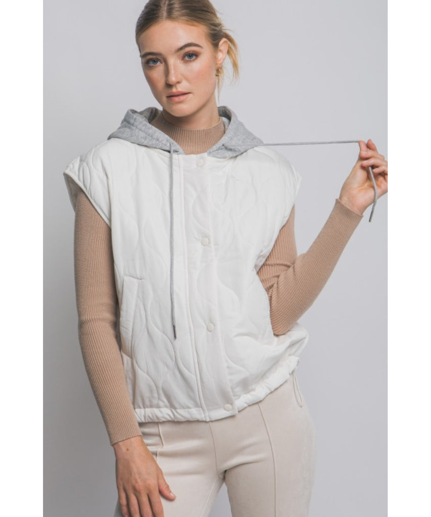 This stylish quilted vest is designed with a hood, snap and zip button closures, adjustable drawstrings, and side pockets for added functionality.