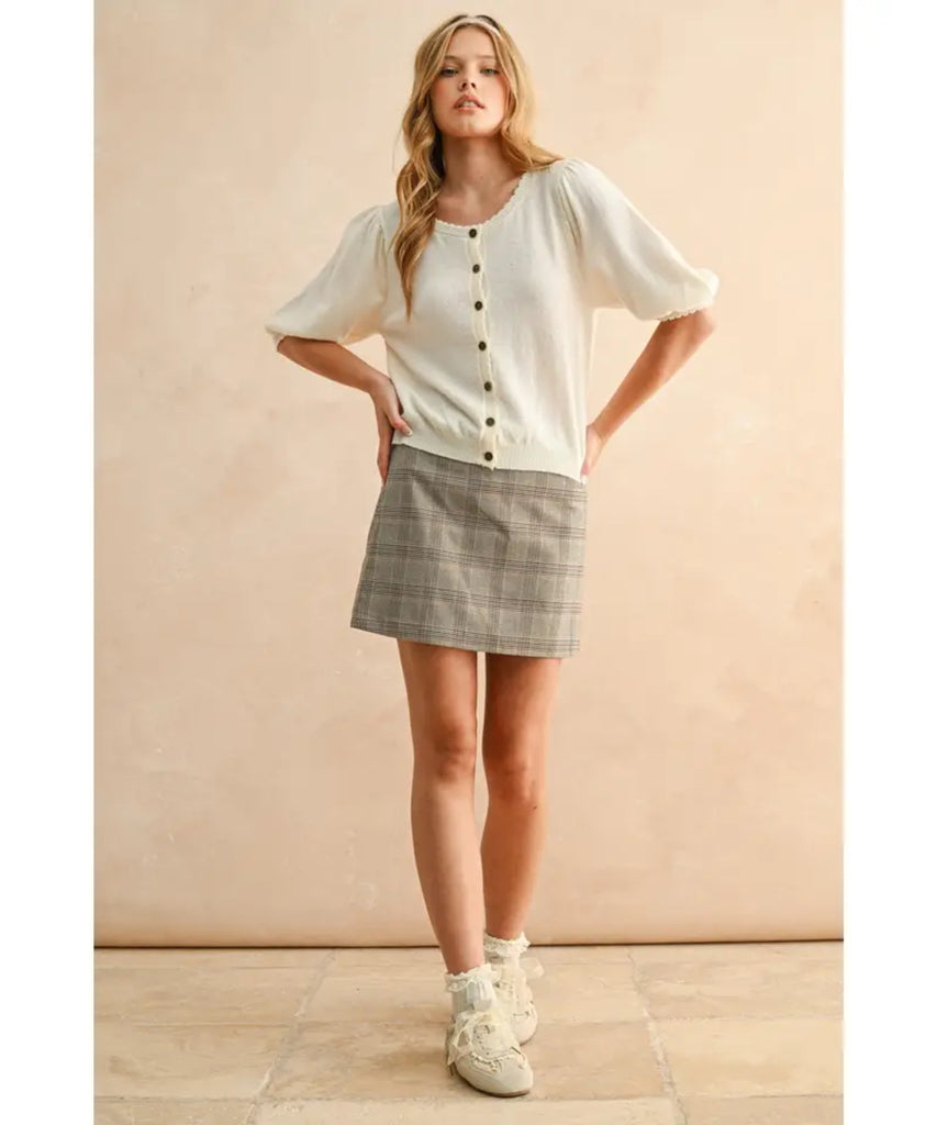 Layer up with this charming knit cardigan that brings the fun! Featuring a playful scallop-trimmed neckline and matching sleeve details, it's designed for effortless style. The button-front closure and contrasting buttons add a pop of personality to any outfit. Perfect for those moments when you want cozy comfort with a touch of whimsy.