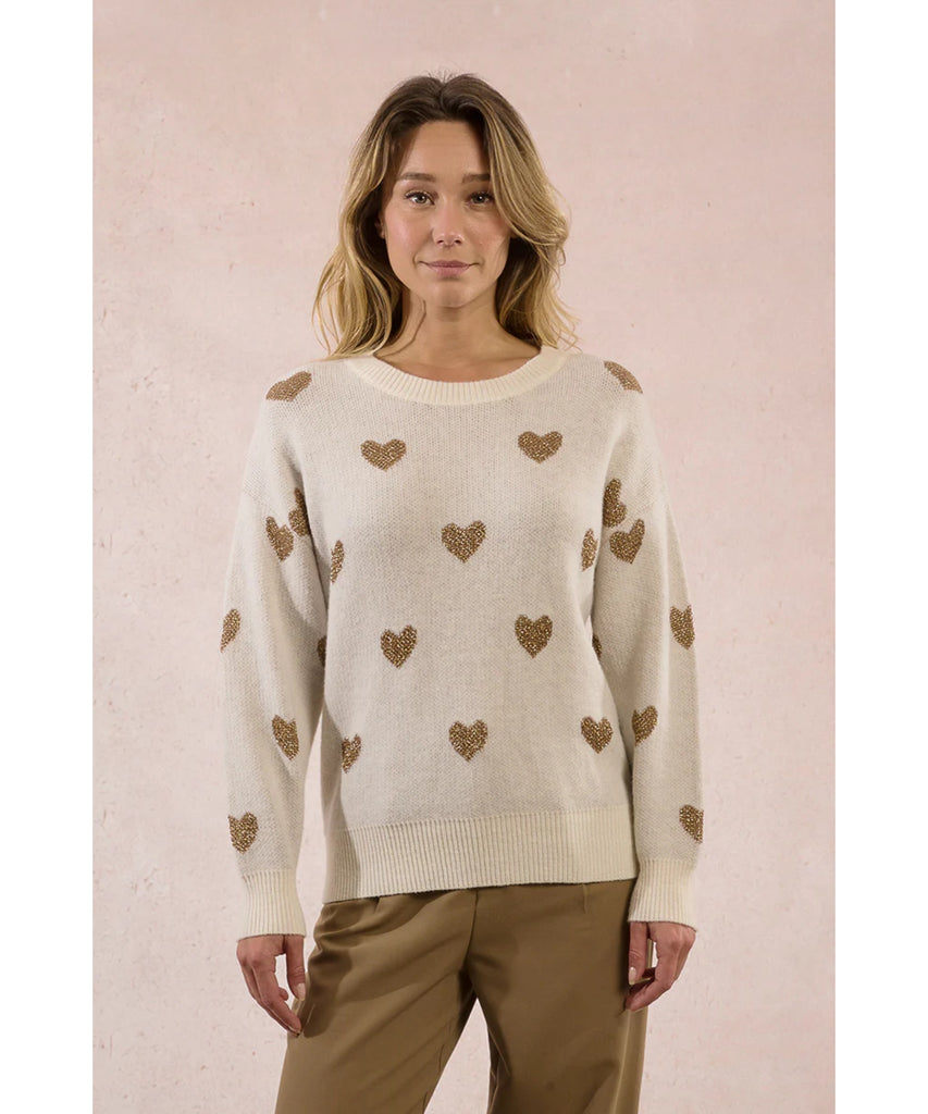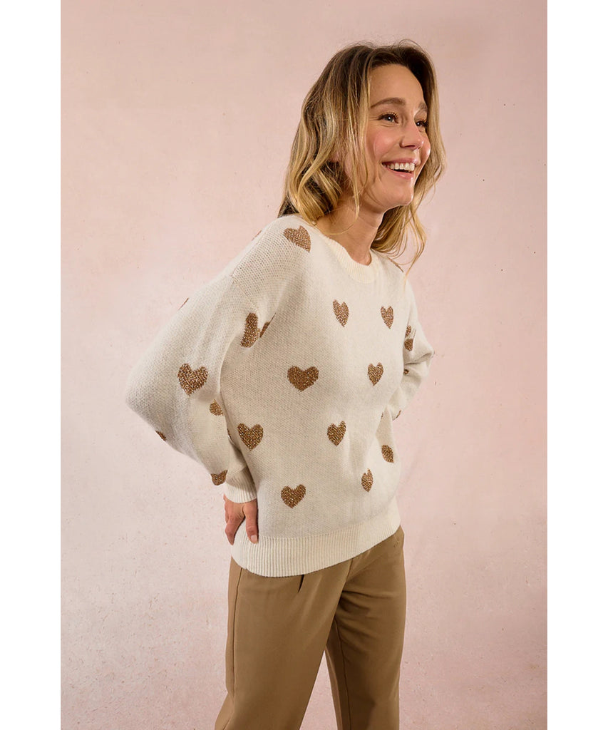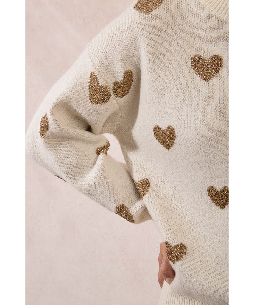 Snuggle into this charming off-white sweater adorned with delicate gold hearts scattered across the front and back. Featuring a ribbed neckline and hem for a polished fit, this cozy layer is impossibly soft and perfect for layering year-round—or stealing hearts this Valentine's season. A wardrobe essential that feels as good as it looks.