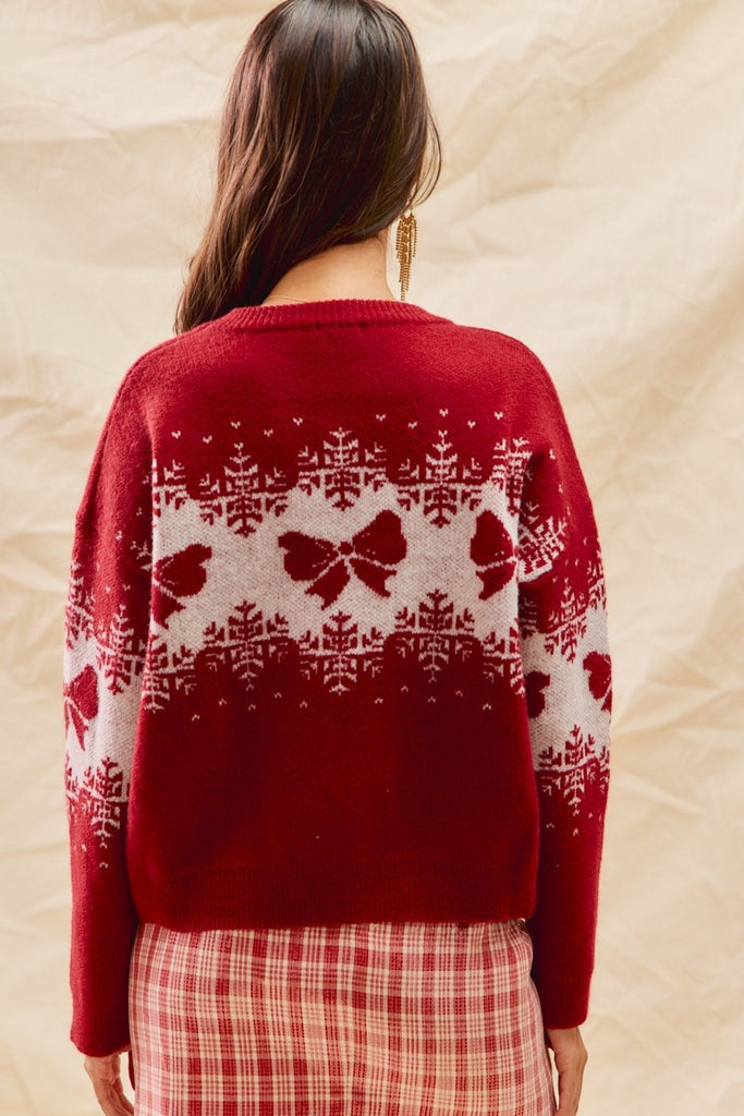 This elegant holiday sweater features a refined design with delicate bows and snowflakes adorning both the front and back. Crafted in a rich burgundy hue, it strikes the perfect balance between festive charm and understated sophistication. Ideal for holiday gatherings and seasonal celebrations, this piece brings timeless style to your winter wardrobe.