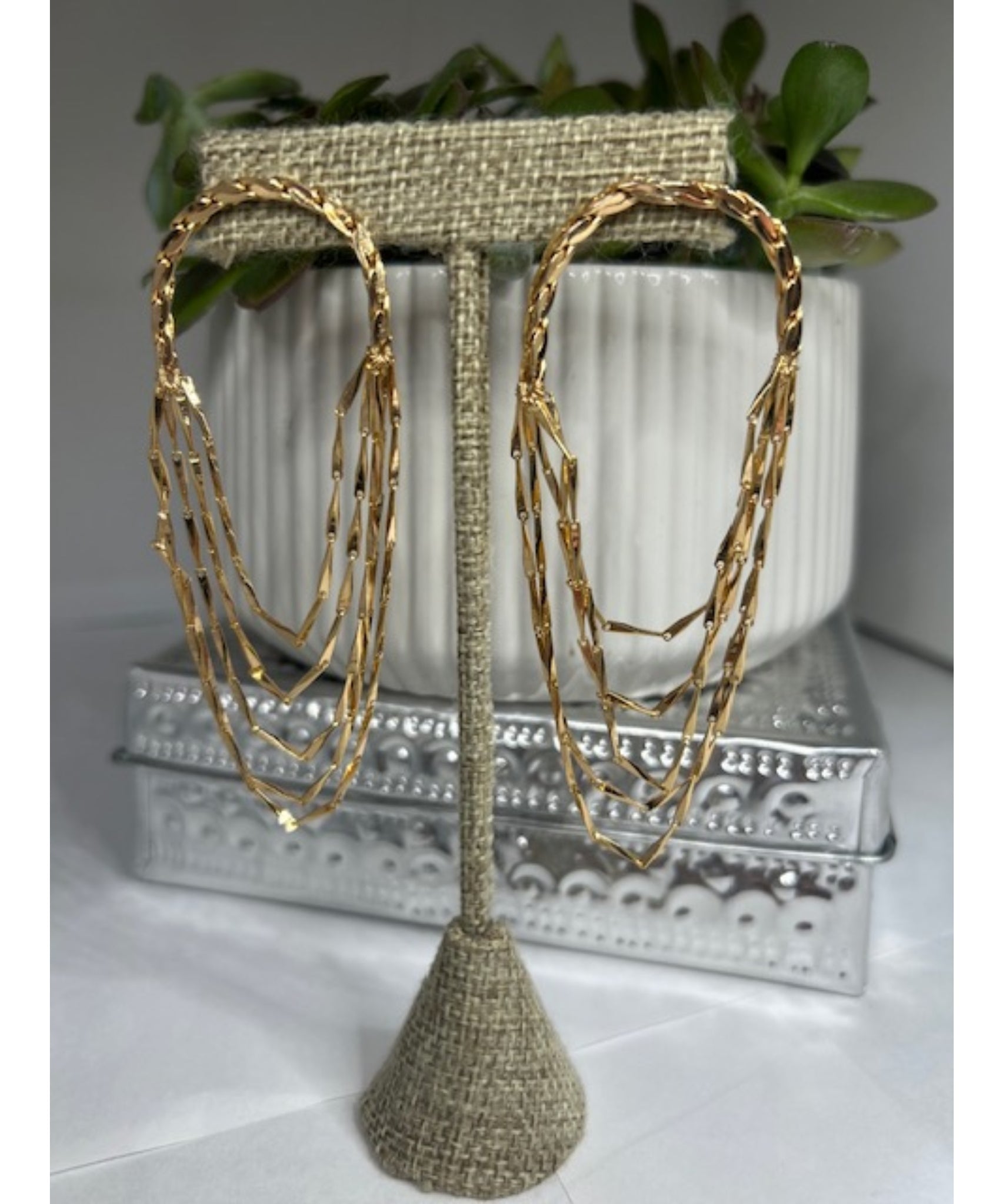 Gorgeous post earrings feature snake chain layered dangle hoops. Stunning!