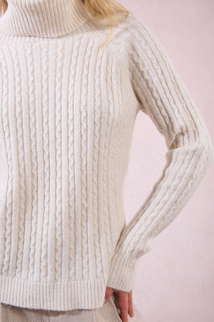 Get cozy in this charming ivory cable knit sweater with a cute cowl neck. Super soft and comfy, it’s the perfect go-to for effortless style and snuggly comfort.