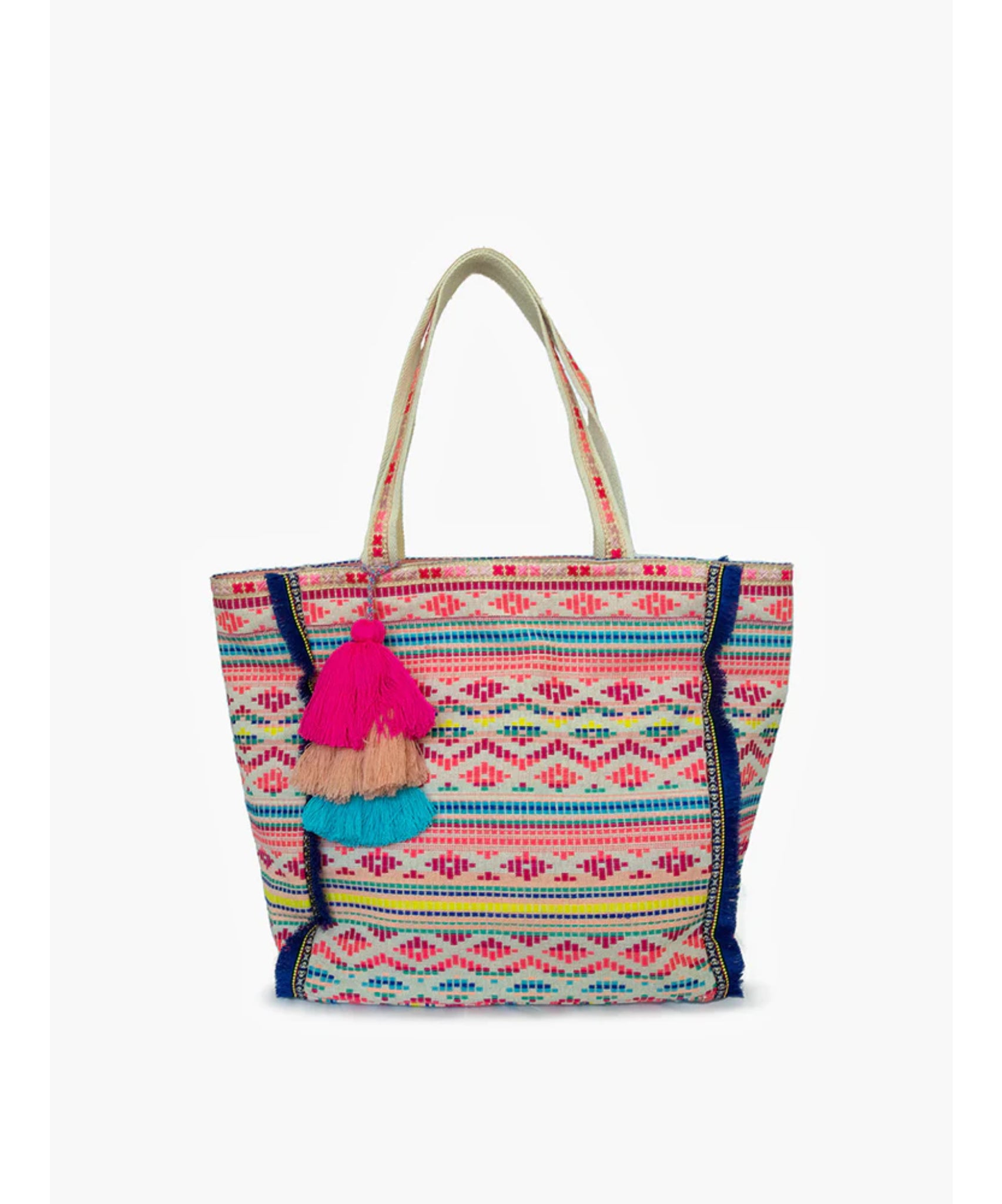 Handwoven bag features an Aztec print and with matching tassels. Made of cotton. Dimensions: 21"L x 15.5"H x 8"D
