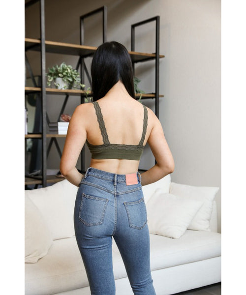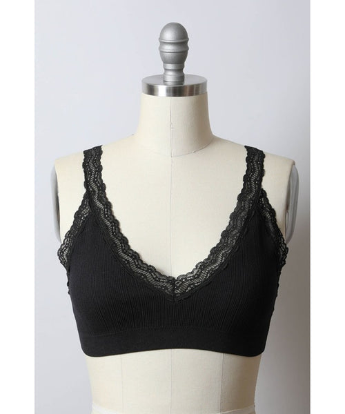 Padded bralette features lace trim and ribbing. Perfect for layering! Multiple color options!