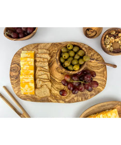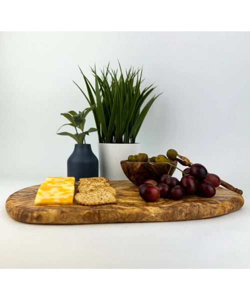 18-19" Cheese Board is suitable for cutting bread, slicing cheese, chopping vegetables and carving meat. Olive wood is a hard wood making it very dense and durable for everyday use. Olive wood is nonporous so no germs or odors are retained. All products are made from a single piece of wood- they are seamless and no two pieces are alike.